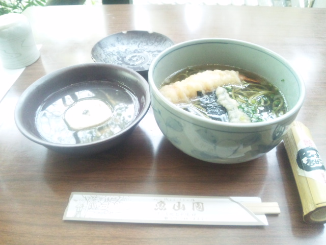三千院近くの旅館でお昼ご飯。天ぷら茶そばと三千院豆腐。どの辺が